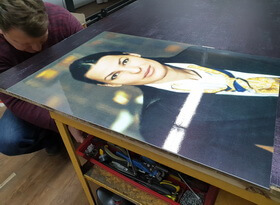 Затем из металлического профиля мы изготавливаем рамку, тыльную сторону которой закрывает прямоугольный белый фон. Распечатанный на плёнке портрет мы приклеиваем к вспененной основе для придания необходимого объёма и жесткости.